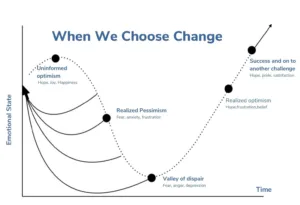 Conversely, when we initiate change, we embark on a path of Uninformed Optimism, followed by Realized Pessimism, the Valley of Despair, Realized Optimism, and finally, Success. At any point along this journey, we can fall prey to our subconscious desire to find comfort and move away from the challenges that change can bring. We accomplish this by giving up too early and finding reasons to quit on the challenging stuff. Although difficult, we can push through on this journey, which is a testament to our resilience and capacity for growth. Recognizing these emotional landscapes is the first step in harnessing change to our advantage.